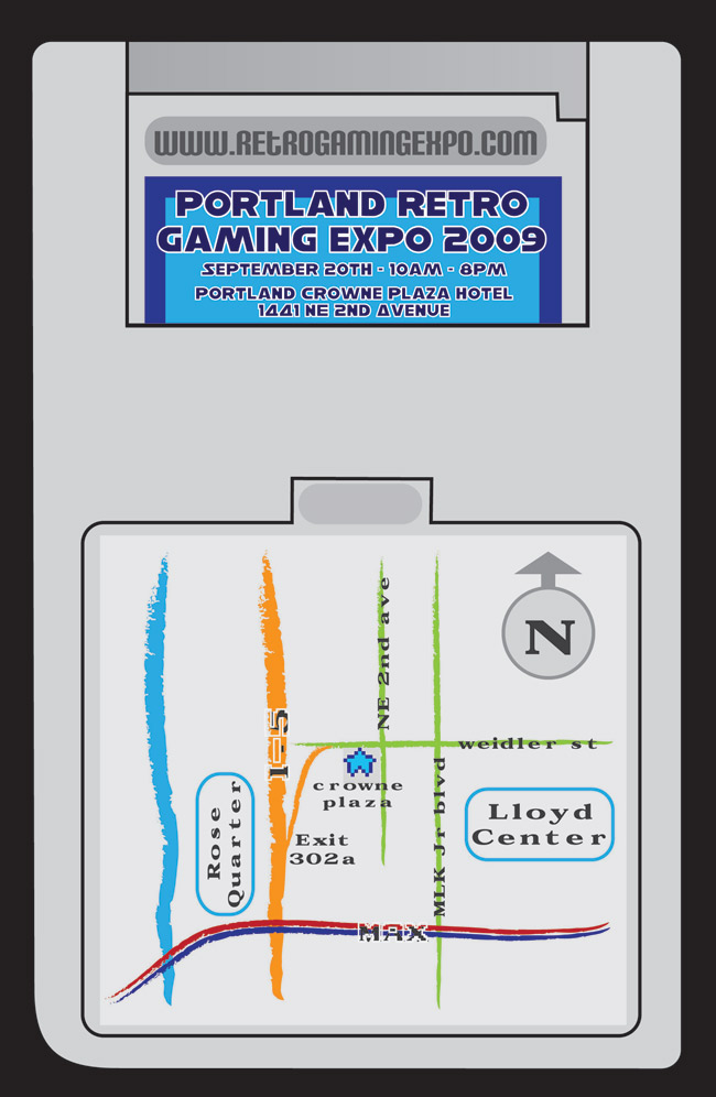 The Holiday Inn venue was not only hard to find, but it was not near any public transportation so we put this big map on the back of the flyer. The famous Atari Adventure "Duck Dragon" shows up here.