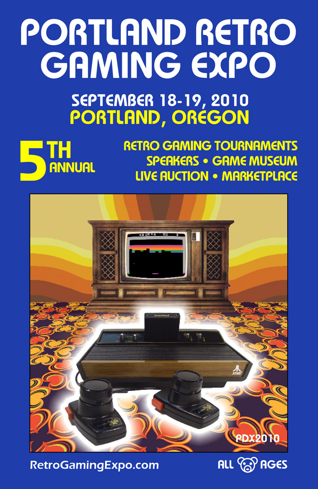 We couldn't decide between an Atari or Nintendo theme for 2010 so we did both. This is the Atari version emulating the early Atari 2600 package designs. This is the first year for a 2-day show.